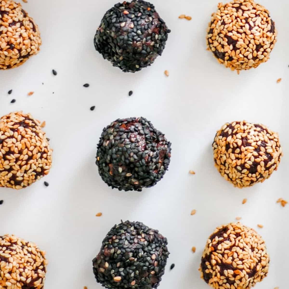 Chocolate tahini date balls that are oh-so-good! Coated in toasted sesame seeds or black sesame seeds, their sweetness is perfectly balanced.