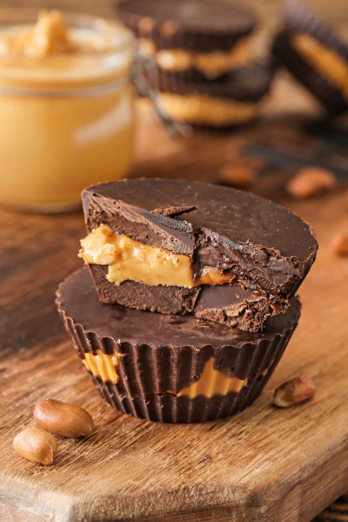 Chocolate peanut butter cups stacked two tall with the top one broken in half showing the inside.