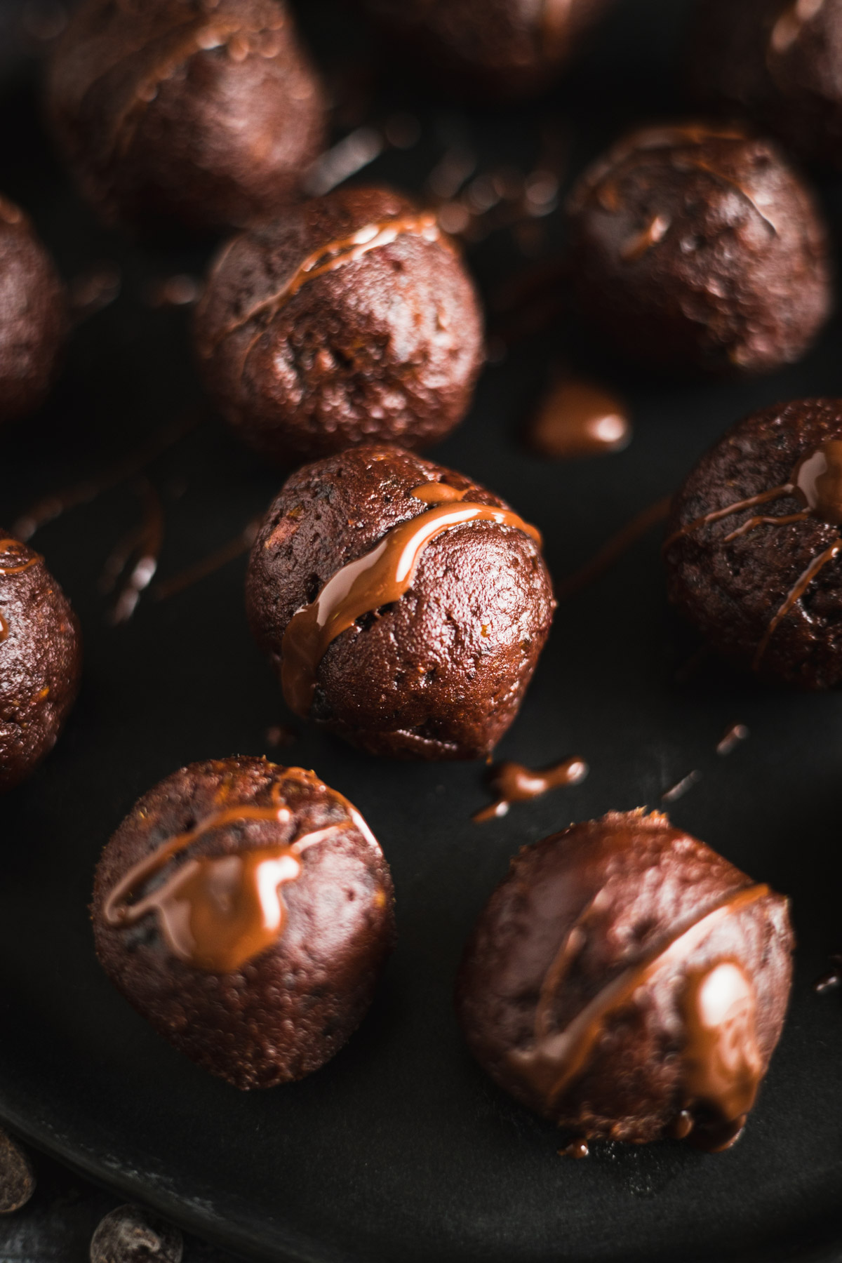 Close-up of several chocolate truffles with a shiny drizzle of melted chocolate on a dark surface.