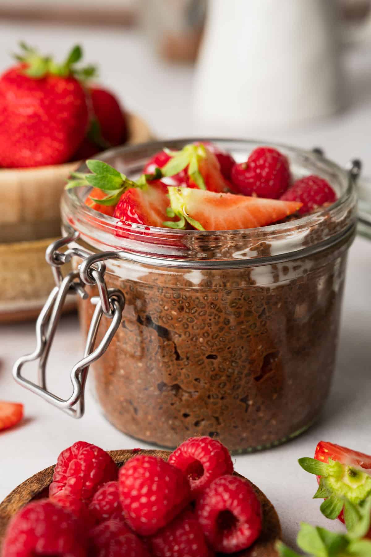 A glass jar filled with chia pudding topped with sliced strawberries and raspberries, with additional strawberries and raspberries in the background.