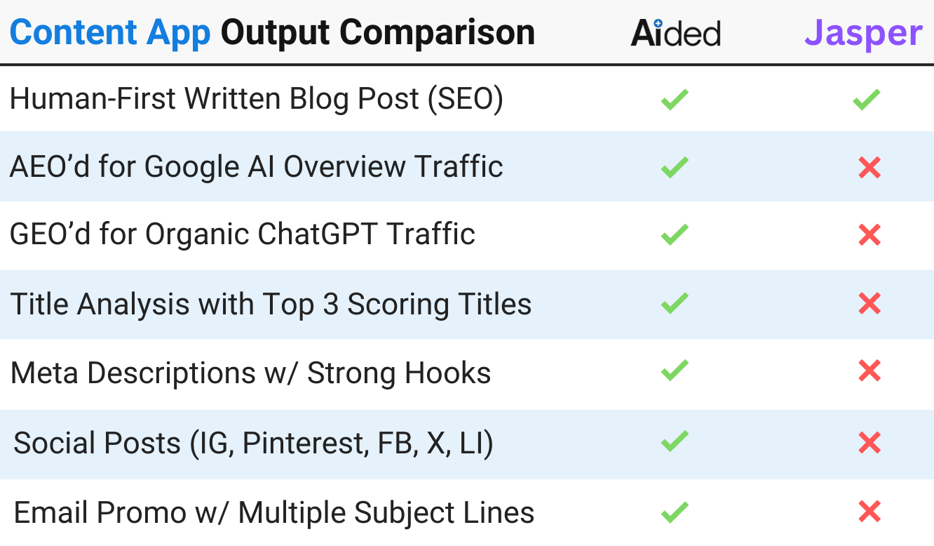 Aided's content creation platform delivers a human first blog post optimized for AEO and GEO, and RankIQ's Content Optimizer tells you what you need to add to compete for page 1.
