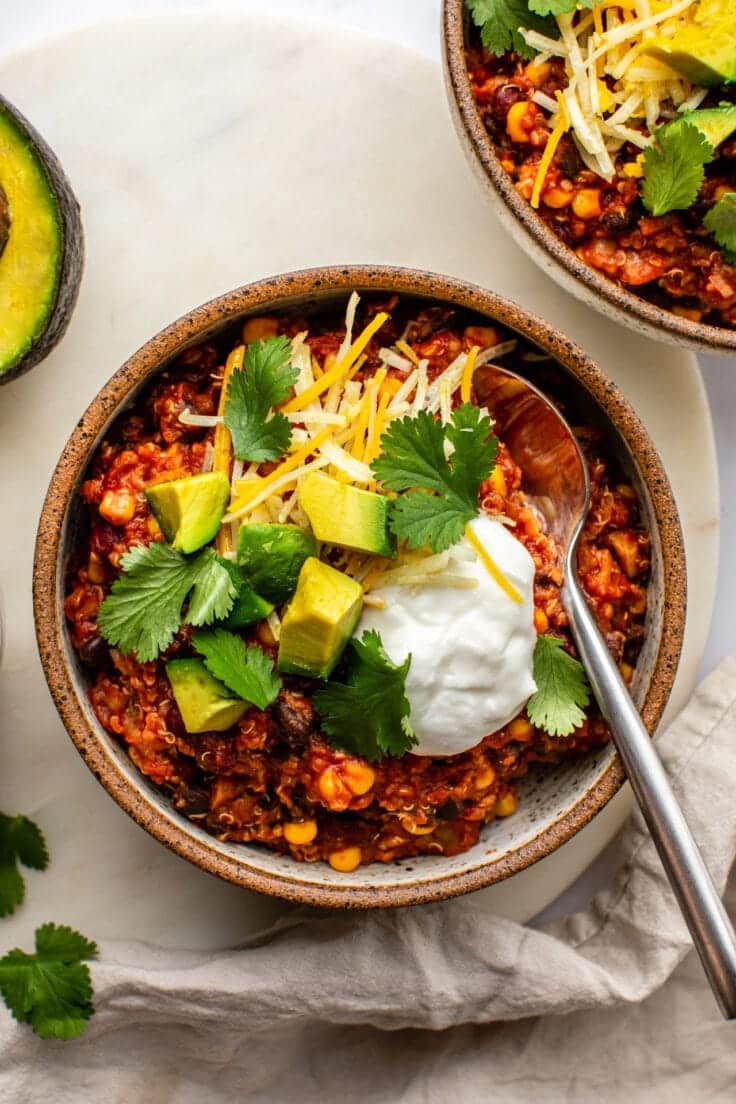 This bean quinoa chili takes just ten ingredients for an easy dinner or meal prep!