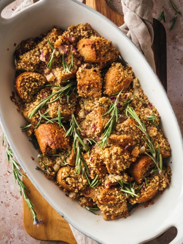 Easy vegan quinoa stuffing that is as nostalgic as can be. It's hearty and filling and can honestly be served as a main dish if you'd like.