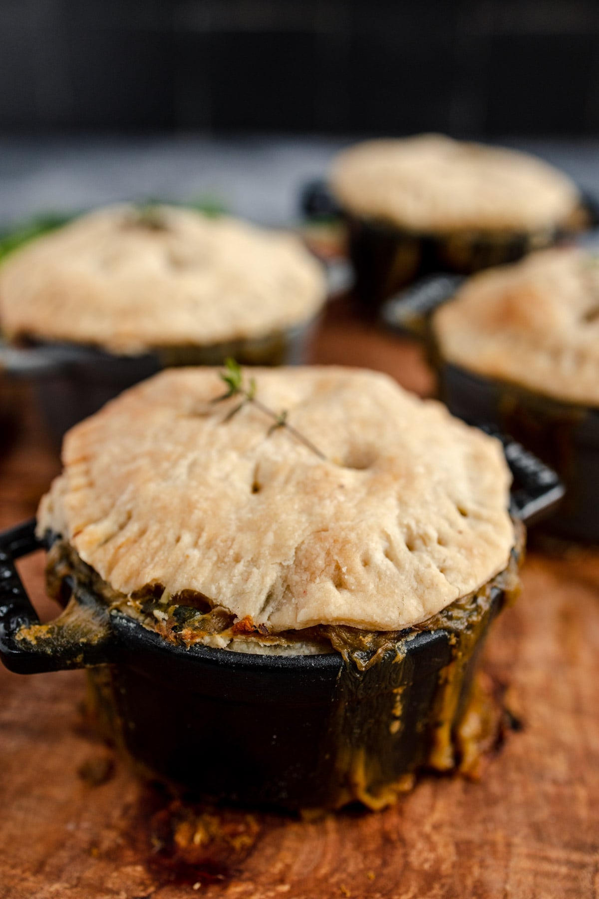 Absolutely delicious, savory vegan pot pies! These tasty, plant-based pot pies are stuffed with nutritious veggies and chickpeas, which will give you a little kick of protein.