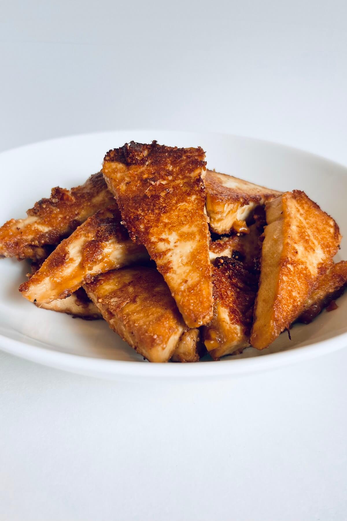 When frying tofu, you’ll get the best results with a super-hot pan. Make sure your pan and your oil warm up enough to give it that good sear. And while you’re at it, use an oil with a high smoking point to get that ultimate crisp.