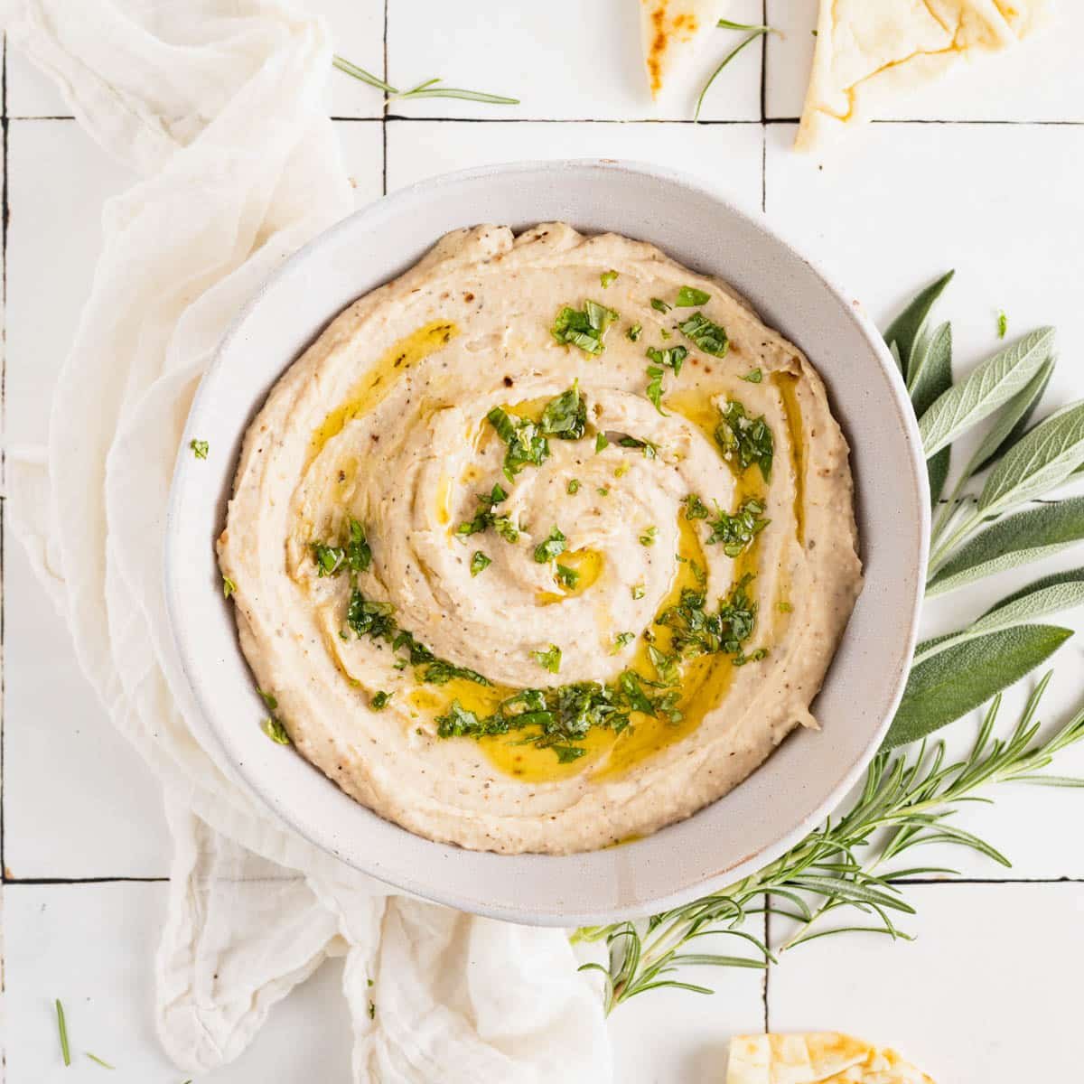 My vegan white bean dip is a healthy option because you’re using wholesome ingredients to make it – garlic, white beans, Italian herbs, and olive oil. If you buy it ready-made from the store, it may not be as healthy simply because there may be additives and preservatives in it.